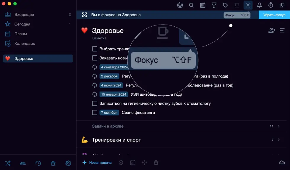 Режим фокуса — это специальный инструмент для сосредоточенной работы над одним проектом и его подпроектами в десктоп-версии. Когда вы его включаете, то во всех разделах приложения будете видеть задачи только этого проекта и его подпроектов. Все остальные проекты и задачи временно скрываются из вида, чтобы ничто не отвлекало вас от главного.