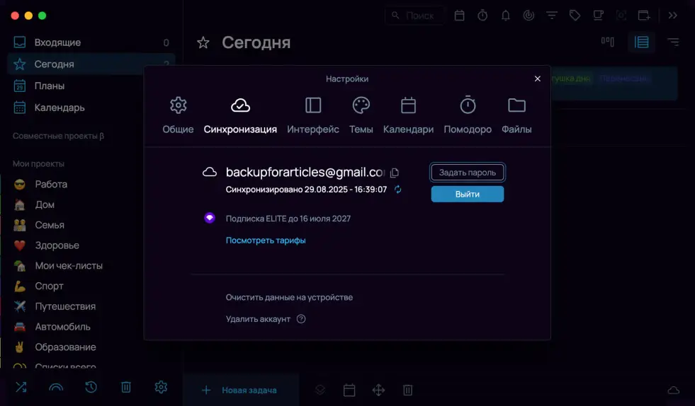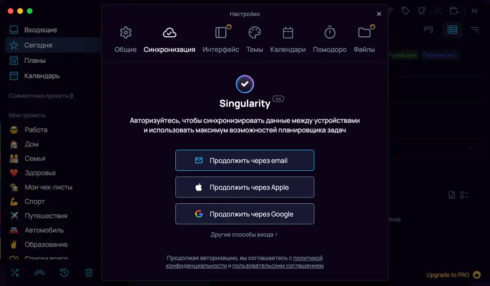 Создание аккаунта — это первый шаг к синхронизации ваших задач и проектов. При первом запуске приложение само должно предложить создать аккаунт.