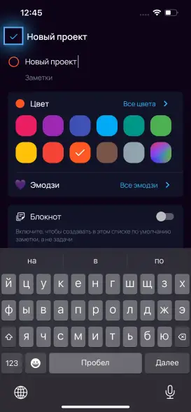 - На новом экране введите название, выберите цвет и иконку. Здесь же вы можете добавить подробное описание в поле «Заметка» с помощью редактора заметок: делать текст жирным, добавлять списки, заголовки и даже вставлять изображения [ELITE]. Если нужно, укажите родительский проект, чтобы новый проект стал вложенным.
