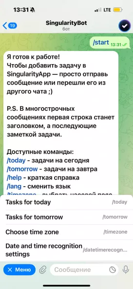При подключении к аккаунту SingularityApp бот постарается определить ваш часовой пояс и запомнит его для вашего аккаунта. Часовой пояс не зависит от устройства и не будет изменяться, если вы меняете время на устройстве. Чтобы изменить часовой пояс — откройте чат с ботом в Telegram и отправьте команду /timezone или выберите её из меню. Бот пришлет список часовых поясов — выберите нужный.