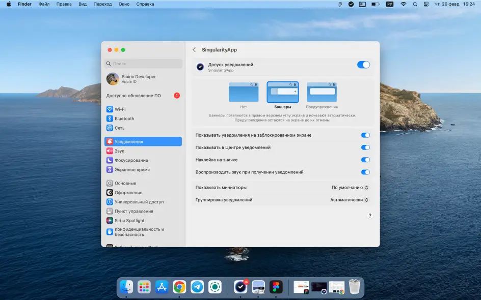 На macOS уведомления из SingularityApp могут дублироваться в системный Центр уведомлений (панель-«шторка» справа). Убедитесь, что вы выдали приложению соответствующие разрешения в системных настройках macOS. Клик по такому уведомлению откроет задачу в приложении.
