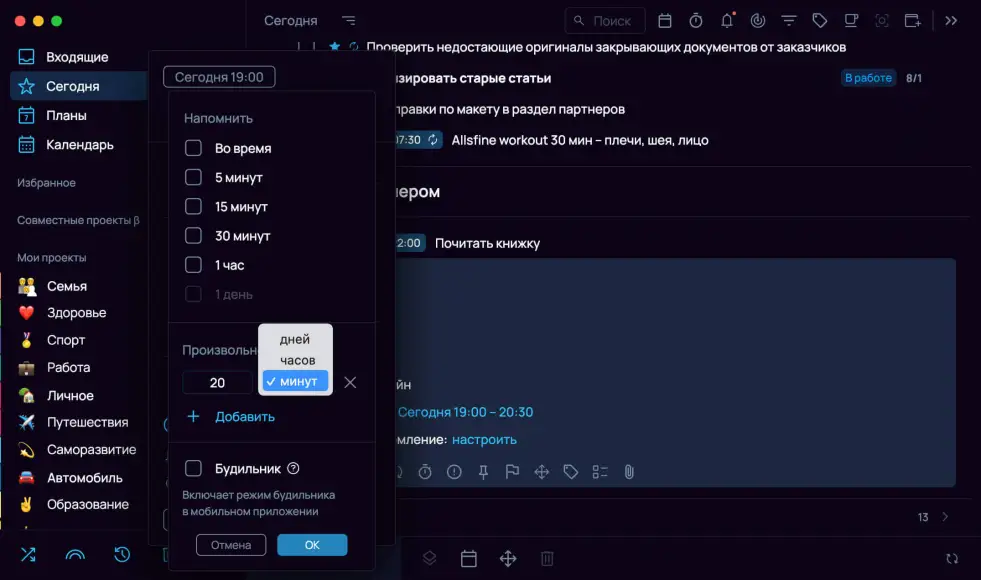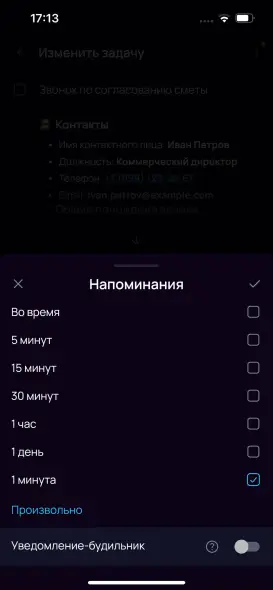 Чтобы напоминание на телефоне сработало как настойчивый будильник, а не как обычное уведомление, отметьте галочку «Будильник» в настройках уведомлений. Настроить эту опцию можно на любом устройстве, но сработает она именно в мобильной версии приложения.