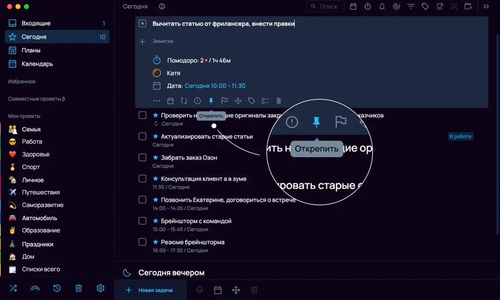 Закрепить задачу — значит зафиксировать её вверху списка для всех страниц, где она будет отображаться (Проект, Планы, Сегодня и другие). Это полезно для задач, которые важно всегда держать на виду. У таких задач в чекбоксе будет отображаться точка, и они будут оставаться вверху списка при любой сортировке. Если вы решите вручную изменить порядок задач, закрепленные задачи можно перемещать между собой.