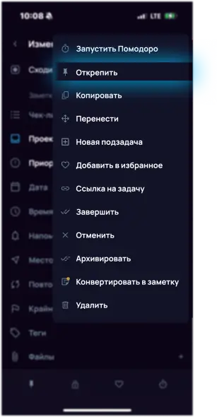 - Выделите задачу и нажмите на контекстное меню внизу экрана, выбрав Закрепить.