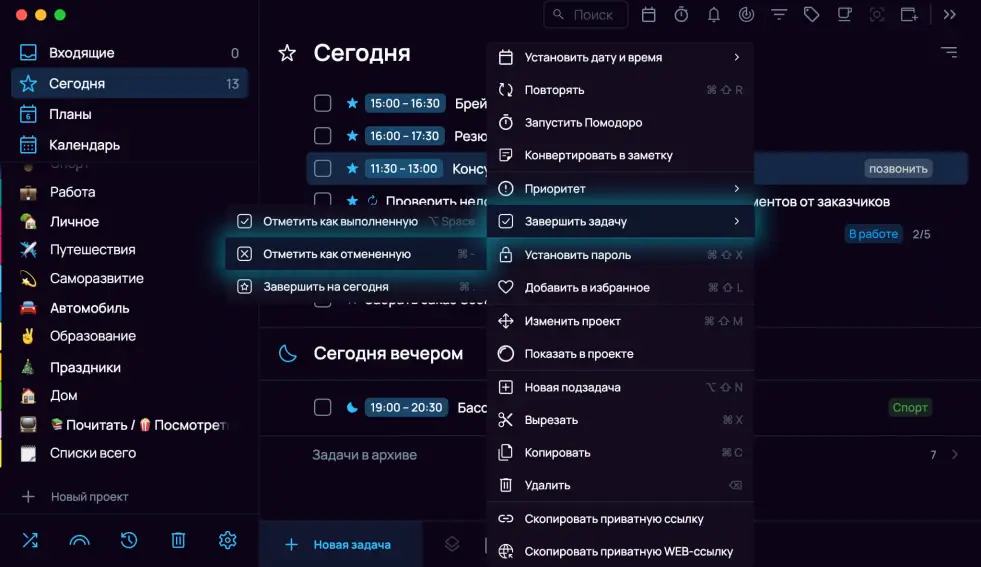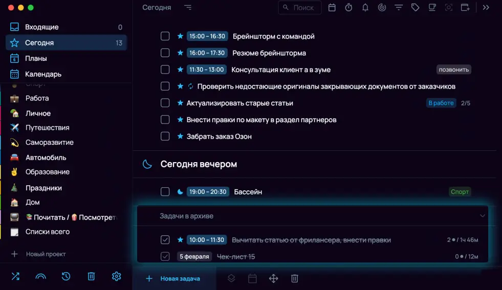 Завершённые задачи попадают в секцию «Задачи в архиве», она отображается внутри проектов и в разделе «Сегодня». Посмотреть все завершённые задачи можно в разделе «Архив».
