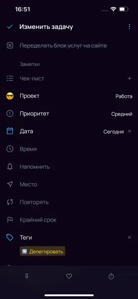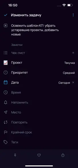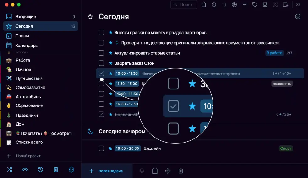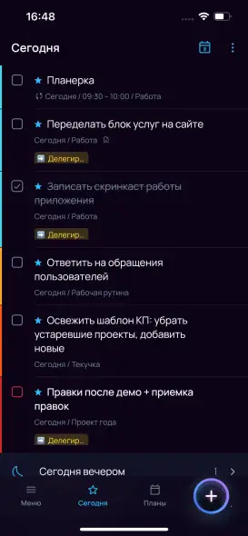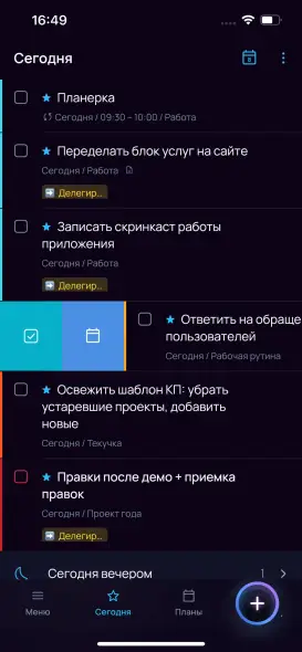 Задачу с датой «сегодня» или раньше можно временно завершить — она будет считаться выполненной, но завтра будет снова активна.