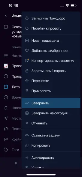 Способ 3. Откройте контекстное меню задачи → выберите Завершить задачу → Отметить как выполненную.