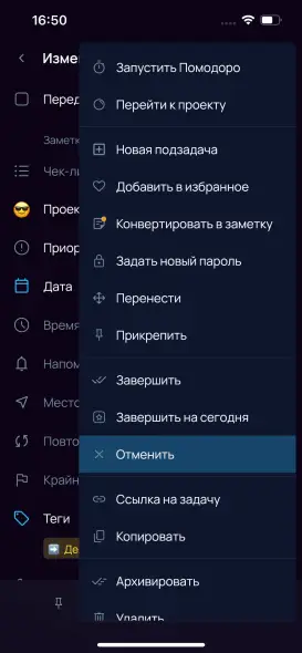 Важно: В отменённой задаче чекбокс будет с крестиком, а название — перечёркнуто полностью. Такая задача останется в проекте до тех пор, пока вы её не заархивируете или не удалите.