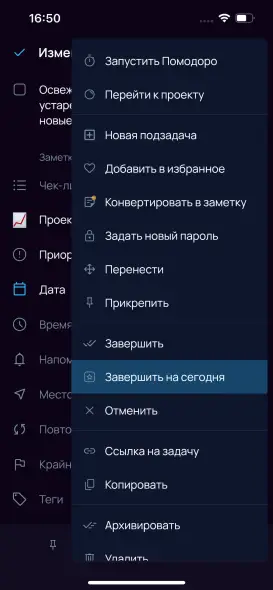 Способ 2. Откройте контекстное меню задачи → выберите Завершить задачу → Завершить на сегодня.